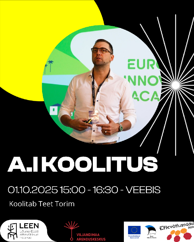 03. oktoobril 2025 kell 10.00 - 17.00 toimub Viljandis Ettevõtlusnädala raames tehisintellekti baaskoolitus. Kas oled mõelnud, kuidas saaksid tehisintellekti oma...